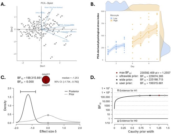 PCA-derived physiological stress index during deload and overload. (A). Smoothed regression line of the PCA-derived physiological stress index across training days, stratified by microcycle intensity (blue = low intensity, yellow = high intensity). (B). PCA biplot of biomarkers showing multivariate key relationships between CK, EWMA of session-RPE, and cumulative wellness. Variable vectors show their loadings to each component, with their angles indicating correlations. Samples are positioned based on their similarity in this reduced dimension space. Only relevant findings are shown. (C). Prior (dashed line) and posterior (solid line) distributions for the microcycle comparison, showing the evidence update. (D). Robustness check of Bayes factors across different prior widths, confirming result stability. CK, creatine kinase; EWMA, exponentially weighted moving average; RPE, rating of perceived exertion; CMJ, countermovement jump; Post-Ex, post-exercise.