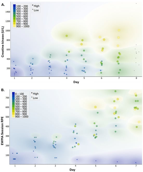 CK and EMWA of session-RPE over time. Daily distribution of (A) CK levels and (B) EWMA of session-RPE across training days, color-coded and sized by PCA-derived physiological stress index. The first three days (Days 1–3; × symbol) represent low microcycle intensity, while the subsequent five days (Days 4–8; ● symbol) reflect high microcycle intensity. RPE was not measured on the final study day; consequently, the figure displays only seven data points for the EWMA of session-RPE.