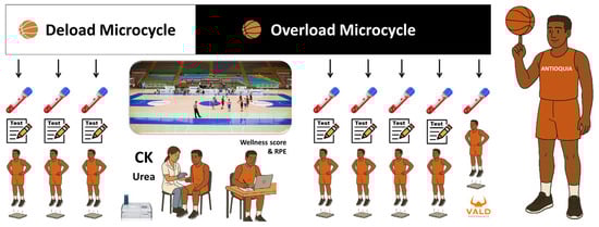 A prospective cohort study with an observational correlational design was conducted following the STROBE guidelines [64]. Elite basketball players followed their usual training program over a pre-planned two-microcycle period. During the first week, three assessment training days took place within a deload microcycle, while in the following days, five assessment training days were conducted during an overload microcycle that included official matches. Blood samples were collected for biomarker monitoring, and CMJ tests were performed before and after each training session (eight non-consecutive days over the two microcycles). Figure 4 summarizes the study protocol.
