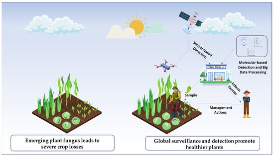 Embracing innovation and the application of advanced technologies are crucial for global surveillance and monitoring of emerging fungal diseases, which can help prevent crop losses. Equipped with multispectral and hyperspectral imagery, satellite and drone-based remote sensing technologies facilitate the early identification of plant diseases (Figure 1). By analyzing environmental and climatic conditions, this data, combined with AI-driven models, enables the prediction of disease outbreaks. The precise early-stage identification of fungal pathogens is facilitated by molecular diagnostics techniques such as polymerase chain reaction (PCR), next-generation sequencing (NGS), Loop-mediated isothermal amplification (LAMP), and sensor-based detection [28,29,30,31]. These methods, supported by metagenomics and bioinformatics resources such as GenBank and MycoBank, enhance the cataloging and analysis of fungal species, even at low concentrations of pathogen DNA, thereby advancing diagnostics and species delimitation [31]. Additionally, Internet of Things (IoT)-based monitoring and automated disease control, as part of smart farming technologies, help maximize agricultural practices by providing real-time data for early surveillance and intervention. However, implementing these technologies in resource-limited settings requires novel cost-effective frameworks.