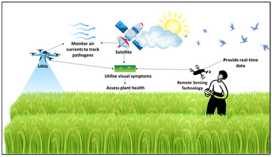 Tracking the atmospheric movement of phytopathogens is crucial for implementing effective quarantine strategies and predicting the long-distance dispersal of airborne pathogens [32]. In this context, UAVs, also known as drones, are effective tools for monitoring the movement of pathogens across large agricultural landscapes. Drones can operate at altitudes ranging from tens to hundreds of meters above the ground, providing real-time data on the spread of plant diseases. The key benefits of using UAVs or drones include their flexibility, high-resolution, and low-altitude imaging capabilities. They are particularly effective for detecting visible disease symptoms, monitoring disease progression, and mapping affected zones. However, dependence on trained personnel for operation and data interpretation is a major challenge.