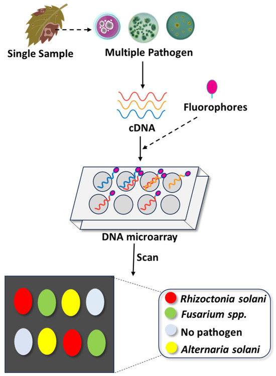 Application cases demonstrate the utility of DNA microarrays in plant pathology. For example, Nikitin et al. [57] used a qPCR microarray system on 48-well silicon chips to identify multiple fungal pathogens, including Rhizoctonia solani, Spongospora subterranea, Alternaria solani, Fusarium spp., and Colletotrichum coccodes. In a separate study, the Array-Tube microarray system, which utilizes 42 species-specific probes targeting the ITS, tef1, and 16S rDNA regions, effectively detected various root rot pathogens, including Aphanomyces cochlioides, Botrytis cinerea, and Penicillium expansum, in artificially infected sugar beet tissues. [58]. This low-density microarray correctly identified pathogens in 23 out of 25 diseased samples, demonstrating its accuracy and efficiency for the simultaneous detection of multiple fungal pathogens. Wöhrle et al. [59] further highlighted that DNA microarrays can be manufactured cost-effectively and reproducibly, contributing to their practical adoption in diagnostic workflows.