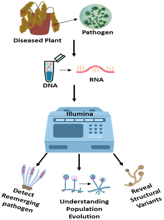 Figure 4. Next-Generation Sequencing (NGS) for detection and characterization of fungal plant pathogens. This schematic illustrates the workflow of high-throughput next-generation sequencing (e.g., Illumina platform) for identifying and analyzing fungal pathogens from diseased plant tissues. The process begins with the collection of symptomatic plant samples, followed by nucleic acid extraction and library preparation. Sequencing generates massive datasets that enable precise identification of fungal species, including unculturable and cryptic taxa. NGS also facilitates in-depth genomic investigations, such as population diversity, evolutionary dynamics, virulence factor profiling, and detection of structural variants. This powerful tool enhances our understanding of emerging fungal threats and supports the development of targeted disease management strategies.