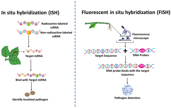 Assays based on DNA or RNA probes, such as fluorescent in situ hybridization (FISH) and in situ hybridization (ISH), have appeared as powerful tools for diagonizing fungal pathogens in plant tissues. These methods utilize the specificity of nucleic acid sequences to identify and localize pathogens within plant samples, offering advantages in both sensitivity and specificity. ISH involves designing antisense single-stranded RNA (ssRNA) probes that bind specifically to the target mRNA of interest (Figure 5). These probes are typically radioactive, although non-radioactive labels, such as biotin, digoxigenin, and alkaline phosphatase, are also employed [73]. Advantages of ISH include its high specificity for target gene expression and ability to provide spatial localization of pathogens within tissue sections. However, limitations include a complex optimization process, potential RNA degradation, and generally lower sensitivity compared to other nucleic acid detection methods.