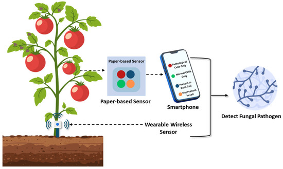 Figure 6. Emerging sensor-based technologies for the detection of fungal diseases in crops. Paper-based sensors using organic dye arrays detect volatile organic compounds (VOCs) emitted by infected plants, enabling early disease recognition before visual symptoms appear. Smartphone-based diagnostic tools interpret sensor data, facilitating immediate and accurate field diagnosis. These portable, affordable technologies support real-time monitoring of plant health and hold transformative potential for disease surveillance, especially in resource-limited agricultural settings.