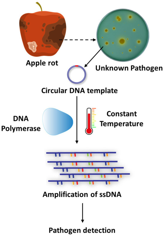 RCA has been widely exploited for the detection of various plant pathogens, particularly fungi. One notable application is the use of padlock probes (PLPs), which are designed to target specific genetic sequences in pathogens. For instance, Lin et al. [89] developed PLPs targeting the TEF-1α gene to detect Neofabraea species (N. malicorticis, N. perennans, N. kienholzii, and N. vagabunda), which cause bull’s-eye rot in apples. The assay demonstrated high specificity and sensitivity across 28 samples, with no cross-reactivity, offering a reliable tool for pathogen surveillance in port quarantine and orchard epidemiological studies. Similarly, RCA has been applied to detect Fusarium species complex responsible for Fusarium head blight through the use of padlock probes targeting polymorphisms in the TEF-1α gene [90].
