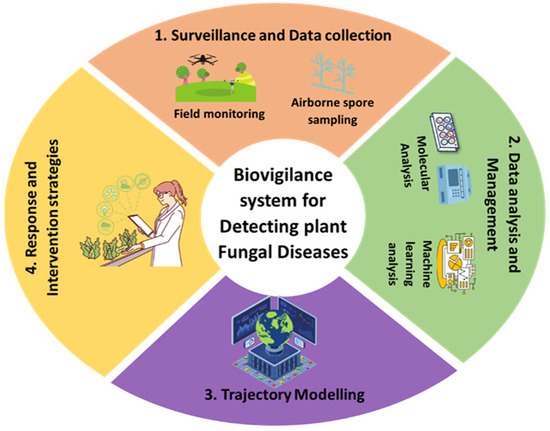 As the technology behind remote sensing continues to evolve, higher-resolution satellite imagery and UAV-based systems will make it increasingly feasible to detect diseases at the individual plant or field level. The combination of remote sensing data, such as satellite imagery and hyperspectral data, with predictive modeling holds the potential to enhance the surveillance of emerging fungal diseases. By integrating information on pathogen movement, predictive models, environmental conditions, and plant health, this system can help forecast disease spread and enable targeted interventions [32,45].