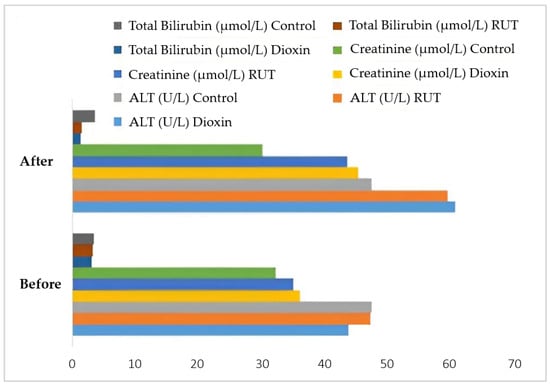 These findings suggest that rutin exerts a modulatory influence on organ function by mitigating biochemical disturbances typically induced by dioxin exposure. The observed normalization of ALT and bilirubin highlights potential hepatoprotective effects, while the stabilization of urea and creatinine suggests an improvement in renal handling of metabolic by-products. Together, these results support the hypothesis that rutin enhances systemic detoxification capacity under dioxin-induced stress.