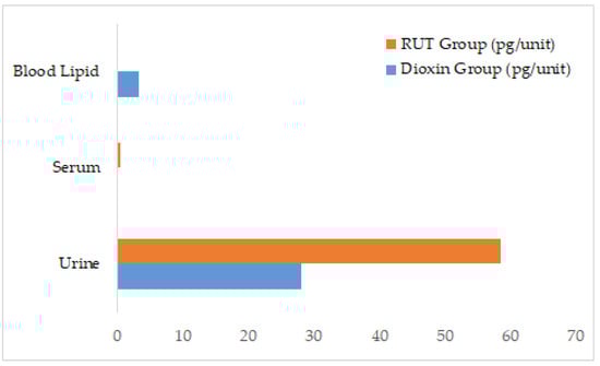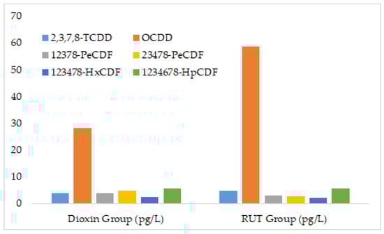 To complement the excretion data, residual concentrations of dioxin congeners in blood were analyzed. Notably, the Dioxin group showed detectable levels only of 2378-TCDF (0.053 pg/L), whereas the RUT group displayed detectable levels of multiple congeners including OCDD (0.599 pg/L), 1234678-HpCDD (0.396 pg/L), and several hexachlorinated and heptachlorinated furans. This pattern suggests that RUT may influence both the retention and redistribution of congeners in circulation (Table 9).