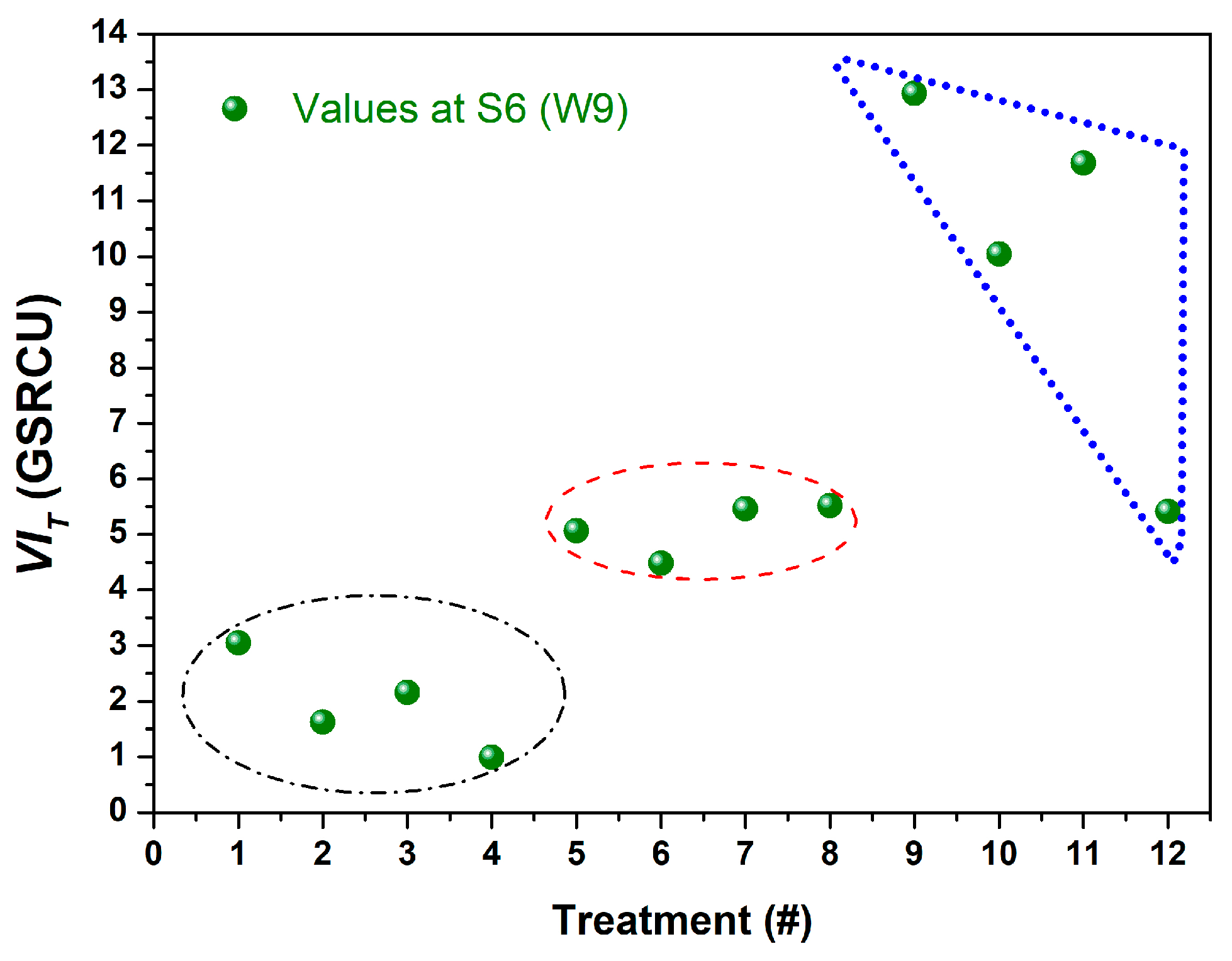 - LDS, MDS, and SDS (S4, S5, and S6, respectively): During this phase, reduced irrigation levels led to drought stress. The plants that perished were those that had experienced the most significant growth but could not meet their water demands for survival. Additionally, the general values of both SI and consistently decreased until they reached zero.