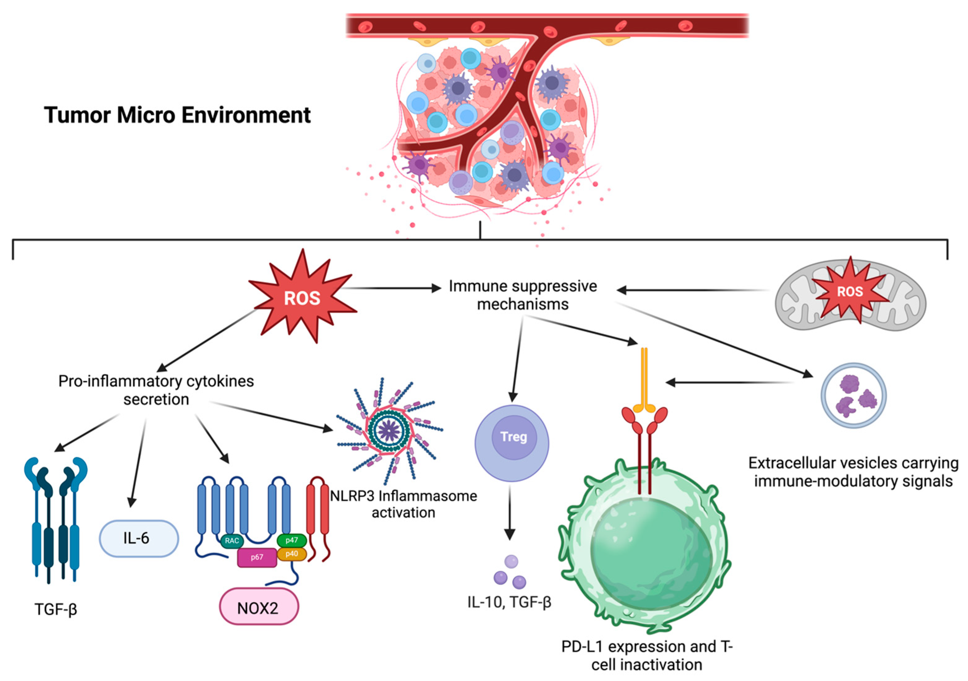 | Gastrointestinal Malignancies [208,261,262,263,264] | Influences tumor-associated inflammation Immune evasion | Chronic inflammation via ROS-driven cytokine release | Anti-inflammatory agents targeting ROS-mediated pathways |