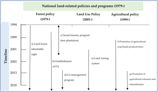 In 1994, land leasing rights were granted to local residents living inside PAs under the land leasing program. In the statement of the 1994 national forest policy, the traditional rights (inheritable right) of people living within and adjacent to PAs were designated, and their forest-related cultural values and religious beliefs were highlighted to be respected [31]. In the Forest (Amendment) Act of 2000 and 2004, a social forestry program was introduced to plant fast growing tree species in order to mitigate the demands of timber and fuel wood [32]. In 2013, the co-management program was introduced to engage local stakeholders’ management and offer livelihood (intensive use of land) supports under a donor-assisted project [9,11] which may have encouraged people to change their agricultural practices (noncommercial to commercial) and encourage deforestation (Figure 1).