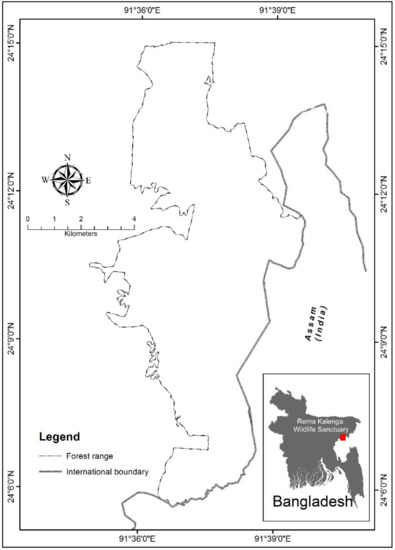 RKWS (24°05′–24°13′ N, 91°34′–91°40′ E), including forest reserve areas and wildlife sanctuary areas, is in the Chunarughat Upazila Subdistrict of Habiganj District, Bangladesh (Figure 2). The area falls under the Sylhet Hills Zone, and the administrative area is known as the Rema-Kalenga Forest Range [36,37]. The reserve contains one of the remnant patches of tropical natural hill forests under extreme threat due to climate change-driven natural calamities and anthropogenic pressures in Bangladesh [38]. The sanctuary is home to diverse flora and fauna and is of high conservation value, as ~80% of the forest is still in the natural condition; plantations cover only ~9% of the forest area [39]. The sanctuary consists of three beats (a beat is the smallest administrative unit of a large forest area), namely, the Rema beat, Kalenga beat, and the Chanbari beat. It is one of the most important PAs as it is the habitat of the globally threatened white-rumped vulture (Gyps bengalensis) [40].