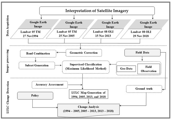 Landsat TM (1994, 2005) and OLI/TIRS (2013, 2018) data were used to classify LULC categories into different informational classes for three periods (1994–2005, 2005–2013, and 2013–2018). The major informational classes were derived from the different satellite images using a supervised classification maximum likelihood algorithm [42,43] targeting five classes: (1) forest: land covered with trees reaching 5 m in height, 0.5 ha in area, and a canopy cover of >10% without other land use; (2) non-commercial agricultural lands: areas of land prepared for crop production such as paddy, homestead vegetable; (3) commercial agricultural land: lemon gardens, tea orchards, groves, vineyards, nurseries, and ornamental horticultural areas; (4) waterbodies: rivers, ponds, ditches, and streams; (5) built-up areas: urban, temporary, or permanent settlements (Table S2). The major classification hierarchy was derived from field observations, topographic maps, historical changes, current documents from the forest department office, and LULC classifications from previous studies. Land cover refers to the physical and biological cover of the Earth’s surface, including artificial surfaces, agricultural areas, forests, wetlands, [44,45] and waterbodies, and is defined by the attributes of the Earth’s land surface and immediate subsurface [46]. Land use refers to the intended use or management of the land cover type by human beings [47] and is defined as the purpose for which humans exploit [46,48] the land cover or the manner in which humans utilize the land and its resources [49], with more complex terms for patterns of human activities such as agriculture, forestry, and building construction that alter land surface processes including hydrology and biodiversity [46]. The classification of each LULC category was based on information from ground surveys and remote sensing.