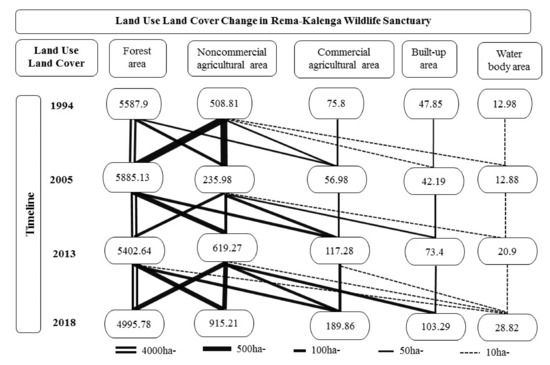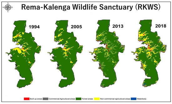 The following are available online at https://www.mdpi.com/article/10.3390/conservation1030014/s1, Table S1: Summary of spatial Landsat datasets used in this study, Table S2: Classification of land use and land cover (LULC), Table S3: Accuracy assessment, Table S4: Transition matrix of LULC in Rema-Kalenga Wildlife Sanctuary (RKWS) between 1994 and 2018 (unit: hectare), Table S5: Annual rates of change, Figure S1: Examples of primary data sources in RKWS. Clockwise: (a participatory mapping, (b) GPS data, (c) informal discussion with local residents, (d) settlement in the protected area (PA), (e) commercial land use, and (f) non-commercial agricultural land use, Figure S2: Major LULC conversions from 1994 to 2018.
