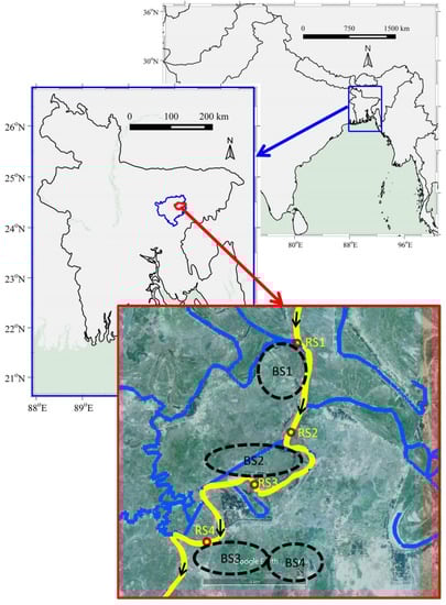 The inset showing the location of Bangladesh. In the enlarged map (bottom), sampled river sites (RS) are indicated by red circles, beel sites (BS) by black ovals, and minor rivers are shown as blue lines. The water flow direction is shown by black arrows on the Dhanu River (yellow line) (Google Earth Pro).