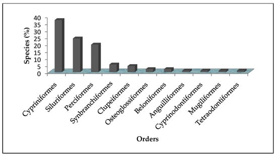 In this study, the most dominant order was Cypriniformes that covered 37.4% fish species, followed by Siluriformes (24.2%), Perciformes (19.8%), Synbranchiformes (5.5%), Clupeiformes (4.4%), Osteoglossiformes (2.2%), and Beloniformes (2.2%). Meanwhile, Anguilliformes, Cyprinodontiformes, Mugiliformes, and Tetraodontiformes were represented by 1.1% of species each (Figure 2). Galib [] recorded similar results from the Brahmaputra River, where the highest 21 fish species made the Cypriniformes order dominant over Siluriformes (19 species), Perciformes (15 species), Clupeiformes (3 species), Osteoglossiformes (2 species), Beloniformes, Tetraodontiformes, and Synbranchiformes (1 species each). Hanif et al. [] and Sultana et al. [] also recorded Cypriniformes as the dominant order in the Gorai River and the wetlands of Chhatak, respectively.