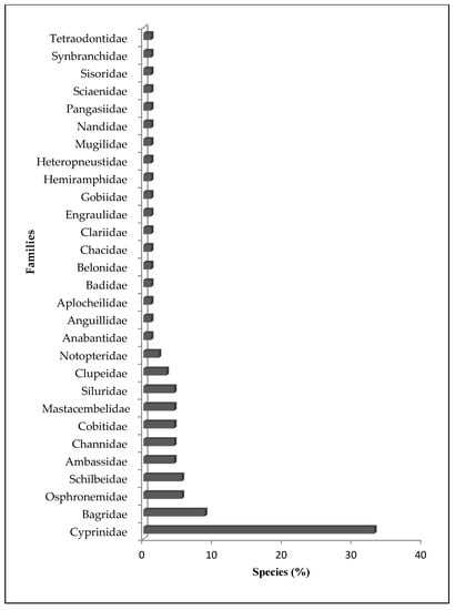 In this investigation Cyprinidae was found to be the richest family with 30 species (33.0%), followed by Bagridae (8.8%); Osphronemidae and Schilbeidae (5.5% each); Ambassidae, Channidae, Cobitidae, Mastacembelidae, and Siluridae (4.4% each); Clupeidae (3.3%); and Notopteridae (2.2%). All remaining families were represented by 1.1% species each (Figure 3). Cyprinidae was documented as the dominant family by Galib [] in the Brahmaputra River, Joadder et al. [] and Mohsin et al. [] in the Padma River, and Chaki et al. [] in the Atrai River. Rahman [] found the Cyprinidae family to be the most populous over all freshwater fish families of Bangladesh. However, there are variations in the species dominance within Cyprinidae family in different water bodies of Bangladesh, which might be due to the geographical and environmental disparities of those rivers.