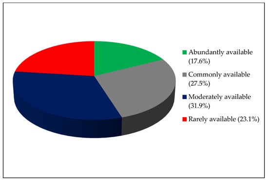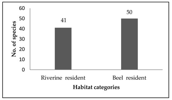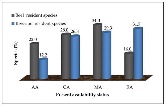 In Bangladesh there are three well known categories of freshwater fishes based on their residential status, such as riverine, migratory, and floodplain resident species. For instance, during the dry season when the water levels of the floodplains reach their nadir, several floodplain-dwelling species take shelter in nearby perennial water bodies such as rivers and deeper beels [], which makes their categorization more complex. However, the maximum lifespan of freshwater fishes is spent in rivers and/or perennial beels. Hence, in the present survey, the total existing fish species were categorized in to two categories where 54.9% were beel residents and the remaining 45.1% were riverine resident species (Figure 5). Their availability status showed that the highest portion of riverine resident species (31.7%) was found under the rarely available category (Figure 6).