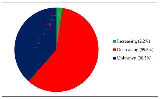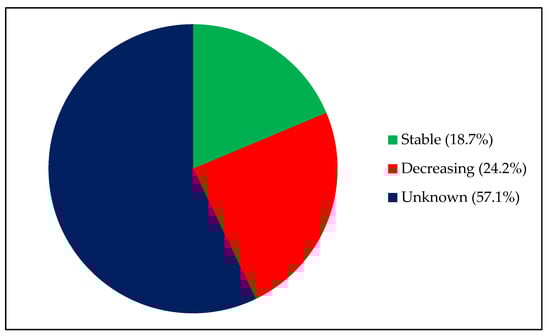 According to the global population trends, the highest percentage of the fish species of the present study was in the unknown category (57.1%), followed by decreasing (24.2%) and stable (18.7%) (Figure 8). A similar trend was found in the Brahmaputra River by Galib [], where the highest percentage of the fish species was in the unknown category (57.0%) followed by decreasing (25.0%), stable (13.0%), and not evaluated (5.0%). Joadder et al. [] mentioned the population trend of 51.0% fish species of the Padma River as unknown, and almost 24.0% were of declining status.