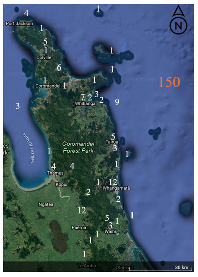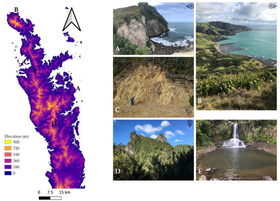 The Coromandel Peninsula is located on the Northeast side of New Zealand’s North Island. This territory is widely known as a tourist hotspot [1,2,3,4,5,6], with a reputation for beautiful landscapes and a high diversity of biological and geological natural features [7,8,9,10,11]. Coastal areas of the Coromandel Peninsula have magnificent geological features resulting from interaction between volcanic and sedimentary (terrestrial and marine) processes (Figure 1). In addition, the land is covered with lush subtropical bush featuring a range of rare and not-so-rare native tree species, providing habitats for birds, mammals, and insects [12]. Moreover, this place was and still is important for the mining industry [13,14,15,16,17,18], with gold and silver epithermal deposits concentrated in areas of hydrothermal alteration due to past volcanic activities [19,20,21,22]. Today, we can find evidence of mining throughout the whole length of the peninsula, as a footprint of European culture together with architecture reflecting European colonization and settlement of the area. In addition, the area contains a large number of Māori archeological sites, as it was one of the first areas settled on a semi-permanent basis by Pacific colonists [23,24]. Hence, this area can be the subject of research in a wide range of disciplines, with a vast amount of information for different areas of research such as biology, geology, archeology, hydrology, social science, and others.