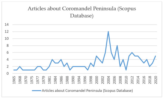 The number of articles written about Coromandel Peninsula each year from 1965 to 2020 (Scopus database).