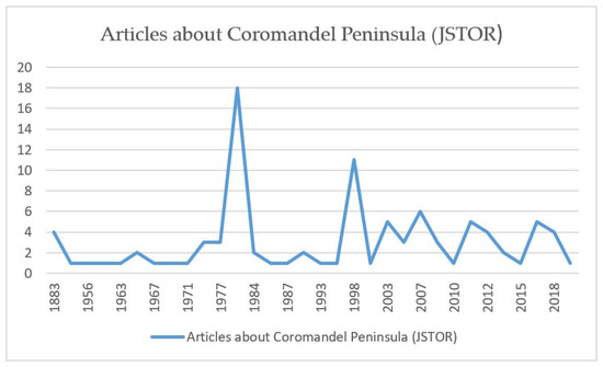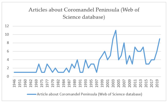 In our analysis of the Scopus database, we utilized the words (phrases) “Coromandel Peninsula” and “New Zealand” as additional search words (Table 1). The search was through the Article title, Abstract, and Keywords. For WoS, we used the same phrases applied for “All Databases” within our searches to cover any entry captured by the site since the platform has been operating. Then, we searched through the JSTOR database, which offers more than 12 million academic journal articles, 85,000 books, and 2 million primary source documents in 75 disciplines [https://about.jstor.org/mission-history/ (accessed on 14 September 2021)] as well as access to electronic resources in a far broader range than Scopus or WoS by providing publications not listed in other databases (e.g., commonly papers published in local or regional scientific magazines). The JSTOR book collection covers scientific reports of local and regional sources, which may not be published by the more mainstream publishers.