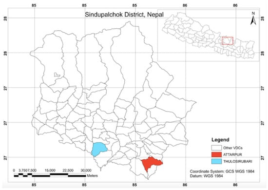 On 25 April 2015, Nepal experienced a 7.8 magnitude earthquake in 14 districts [,], followed by a series of aftershocks that affected 8 million people and resulted in the degradation of 23,000 ha of forestland by the landslide and human encroachment for the resettlement []. In particular, the Sindhupalchok district was one of the districts that was most affected by the earthquake in 2015 [,,]. In total, 3075 people, including 1230 children, lost their lives, and 1450 people were injured. In addition to the loss of lives and destruction of property, the disaster had consequences for the ecological health, geology, and biodiversity, as well as for the wildlife and freshwater resources in the area [].