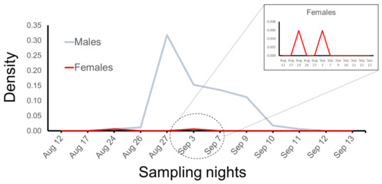 The minimum observed density per survey night varied remarkably, showing a rapid increase to a peak at the end of August followed by a slower decrease in the following two weeks. The mean observed density for males was 0.32 individuals per transect m2, whereas that of females was 0.006 individuals per transect m2 (Figure 2).
