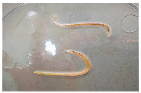 The two parasitic nematodes (at the bottom Individual 1 and at the upper Individual 2) that were obtained from the stomach contents of the Mediterranean monk seal (credits: Laboratory of Ichthyology and Hydrobiology, Dept. of Ichthyology and Aquatic Environment, University of Thessaly).