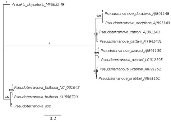The morphological analysis of the parasites revealed the presence of two alive intact female individuals that were 4.8 (Individual 1) and 4.1 cm (Individual 2) in length, respectively. The amplified COI sequence revealed a length of 585 bp. Blast analysis through the NCBI GenBank established a 96% similarity with the species Pseudoterranova bulbosa. A Bayesian phylogenetic tree was constructed by utilizing ten Pseudoterranova sequences, one sequence of the outgroup Anisakis physeteris (Table 1) and the studied sequence of Pseudoterranova spp. Sequences were aligned by AliView (Alignment Viewer and Editor) [51]. The evolutionary relationships between the specimens and the other species of Pseudoterranova spp. are shown in the phylogenetic tree that was constructed (Figure 2). The highest sequence divergence value of the studied sequences was that recorded for the Pseudoterranova depiciens and the Pseudoterranova azarazi, whereas the lowest one was recorded for P. bulbosa comparison (Table 2).