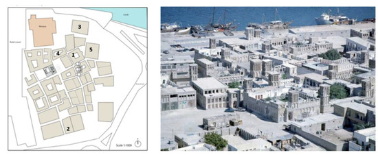 (Left) Site plan of Al Faheidi Historic area in Dubai. (Right) Areal image of the area in the 1970s. Source: Dubai Municipality.