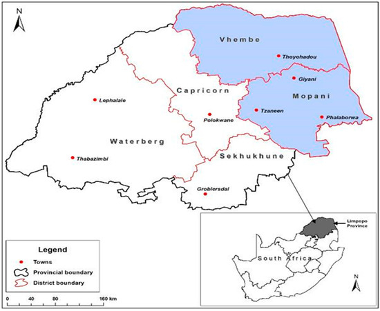 The average maximum temperature in Mopani for January ranges from 21 °C to 37 °C; the average minimum temperature is between 5 °C and 12 °C; the average annual temperature is between 13 °C and 27 °C [11]. Average annual rainfall of approximately 400–500 mm falls on the eastward side of the Drakensberg escarpment, while 600–800 mm and 800–1000 mm fall on the foot and along the escarpment, respectively [11]. Rainfall in the Mopani District is generally low, particularly in the lower parts of the Giyani and Ba-Phalaborwa municipalities. Letaba River catchment and all its tributaries are the main source of surface water for Mopani. Borehole water has the potential to supplement surface water. There are rivers throughout the district, some of which are used for irrigation. Among the agricultural products are citrus, mangoes, vegetables, poultry, and livestock. The Tzaneen, Letaba, and Maruleng municipalities are also heavily dependent on agriculture as one of their key economic sectors. There is generally a shortage of water in Giyani, so irrigation is limited in this area. According to the Limpopo state of the environmental report [11], the district has a wide range of soil capabilities for crop and livestock production.