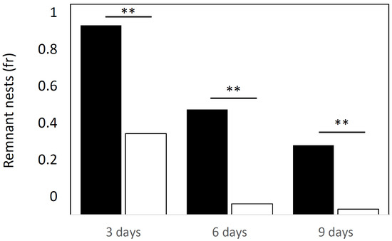 However, the number of remnant nests was significantly lower in controls when compared to experiments in any recording session (after 3 days: χ2 = 18.91; 6: χ2 = 18.388; χ2 = 11.98), analogous to the number of remnant eggs (after 3 days: χ2 = 58.38; 6: χ2 = 55.163; 9: χ2 = 35.94; d.f. = 3, p < 0.001; Table 1; Figure 2). We did not observe seasonal differences in trends among seasons (χ2 test, p > 0.05).