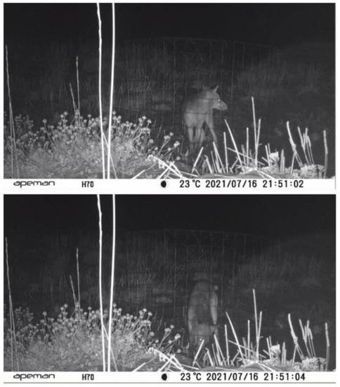 Foxes and hooded crows were the main predators. However, cages are selective for different predators: when the cage (experimental nests) was present, the predation by foxes was significantly higher. This phenomenon was probably due to the ability of this generalist mammal to adapt its behavior and overcome the cage system by digging deep under the cage and feeding on the eggs (Figure 3) [24]. Furthermore, this canid was apparently able to associate the presence of the cage with the presence of eggs [24]. Thus, the cage constitutes a clue for the presence of food that is easily identified by this predator [25]. Further effort should be devoted to developing cages that are designed to impede the predation by foxes. In addition, a limited number of hooded crows overcame the grid of these cages. This fact should be particularly considered in suburban areas where these birds occur at high density. In this regard, further creative solutions should be developed with the aim of improving the control of predation and, at the same time, allowing the movements of plovers.