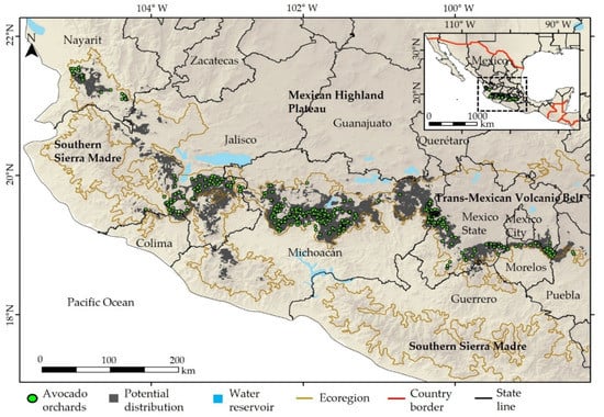 - De-la-Vega-Rivera, A.; Merino-Pérez, L. Socio-environmental impacts of the avocado boom in the Meseta Purépecha, Michoacán, Mexico. Sustainability 2021, 13, 7247. [Google Scholar] [CrossRef]