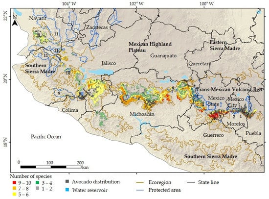 | Species | Ecoregions | Potential Distribution Mexico (km2) | Habitat Loss Mexico (%) | Potential Distribution TMVB (km2) | Habitat Loss TMBV (%) |