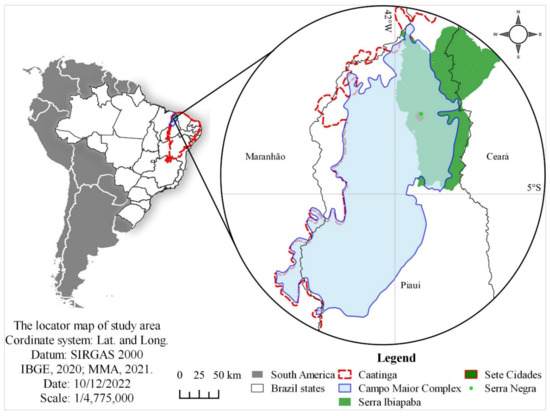 The Campo Maior Complex, with 41,420 km², is located almost entirely in Piauí state (76 municipalities), with a small part in Maranhão state (5 municipalities). More precisely, the CMC is in the northwest of Caatinga, with a population of 2,119,688 inhabitants, with 74% of these inhabitants residing in urban areas. These conservation units (CUs) are located within the CMC: Sete Cidades National Park, Recanto da Serra Negra Natural Reserve, and Serra Ibiapaba Environmental Preservation Area [22,23,24]. The perennial rivers named Longá, Poti, and Parnaíba are present in the area. The CMC is an ecotone between the savanna-like Cerrado and Caatinga.