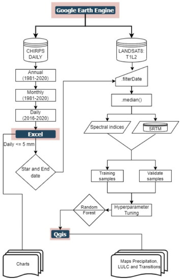 CHIRPS data were downloaded to identify the most significant period of consecutive days with a daily mean of rainfall below 5 mm [26]. Obtaining and filtering the rainy data was essential for this study, because the vegetation in the region is sensitive to changes due to rainfall. This procedure allowed a better interpretation of the targets to be collected as samples for the land-use and land-cover classification method. Figure 2 presents the flowchart of the procedure workflow.