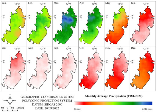 Figure 3 shows that March is the month with the highest historical average-monthly-precipitation (1981–2020), and the spatial distribution of this precipitation in the Figure shows that the northern region of the CMC area is the one that reaches the highest volumes of rainfall. The southern part of the CMC area is where the lowest values for precipitation are recorded for the longest time. These values correspond to the CMC area’s most significant drought characteristics in Caatinga. This pattern demonstrates the seasonal complexity of the territory and the demand for the characterization of the rainfall regime.