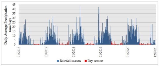 The rainfall data from 2016 to 2020, generated on the GEE platform, were extracted in ‘.csv’ format. The most extended period of days with daily-averaged precipitation of less than 5 mm/day was filtered in MS Excel. Figure 4 presents the data extracted from the CHIRPS daily series for 2016 to 2020.