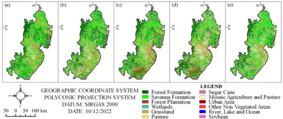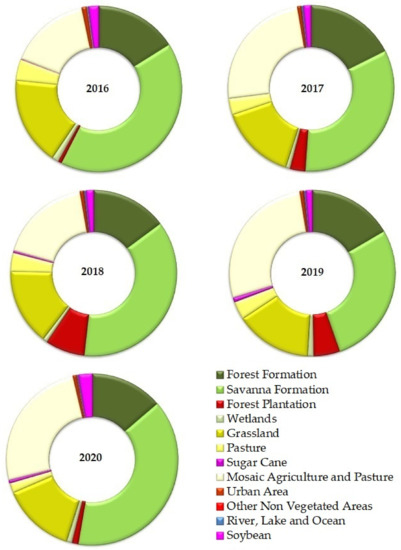 For 2018 and 2019, cloud cover was less than 15% and 40%, respectively. For the other years, the parameter was less than 10%. This difference is a consequence of the lack of better-quality data for full coverage of the CMC area. We considered the same subset of thematic land-use and land-cover (LULC) classes over time: Forest Formation; Savanna Formation; Forest Plantation; Wetlands; Grassland; Pasture; Sugar Cane; Mosaic Agriculture and Pasture; Urban Area; Other non-Vegetated Areas; River, Lake, and Ocean; and Soybean [14].