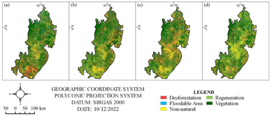 The Non-Natural Formation class indicates the permanence in some non-natural formation classes. The Floodable Area thematic type shows the differences between natural and non-natural classes for river, lake, and ocean. The Deforestation class indicates the changes of pixels from the natural vegetation (forest and savanna) formation to non-natural types. The Regeneration class suggests changes in pixels from a non-natural class to a natural-formation class. The Vegetation class indicates the permanence of the natural formation.