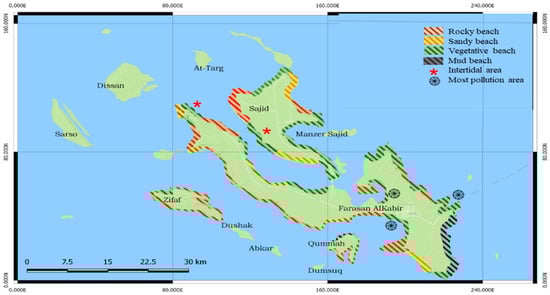 The coastal zone is comprised of a mix of natural beaches that are rocky, sandy (fine or coarse coral fragments), or vegetated [9,23] as seen in Figure 1. The coastal area of the Farasan Archipelago is a major source of income for local inhabitants and communities [24]. It is an area of national and international significance for breeding seabirds, shorebirds, and marine mammals in the Red Sea, including the endemic Larus leucophthalmus and Dromas ardeola [25]. It is the site for the unique annual aggregation of parrotfish [26]. To coincide with this aggregation, the Al Harid Festival occurs in March or April every year in one of the inner bays of Farasan Alkabir Island. The parrotfish, in large numbers, move into the shallow water of the bay where people can easily harvest them in large quantities by wading into the water with nets [26]. In addition, it supports a large number of marine, mangrove, and wetland species [27].