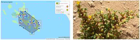 Twelve species were chosen to represent the threatened species and habitats of the Farasan Archipelago for the regional conservation assessment (Table 1). Six of which represent the coastal areas vegetation: two mangrove plants and four species of Zygophyllaceae. The remaining six are the nationally rare restricted species to the Farasan Islands: one Lamiaceae, one Poaceae, two Euphorbiaceae, one Cleomaceae, and one Vahliaceae. Blepharis saudensis and Indigofera cordifolia were excluded as they have recently been assessed as Endangered and Nationally Endangered, on the basis of the IUCN criteria [21,22], respectively. Names were updated following the World Flora Online and relevant taxonomic publications, details can be found in Table 1.