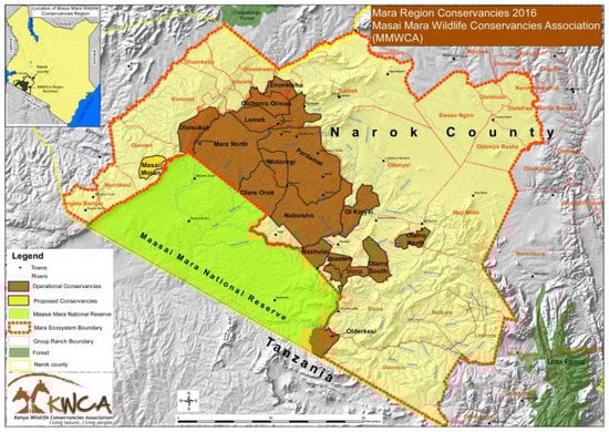 The study was conducted in four conservancies in the Southern part of the Mara ecosystem, namely, Mara Siana (10,000 acres), Ol Kinyei (18,641 acres), Naboisho (53,446 acres), and Olare Motorogi (33,386 acres). The studied conservancies’ boundaries are contiguous to Maasai Mara National Reserve and are therefore key wildlife dispersal areas (Figure 1). The study area is located in Narok County, which lies in Southwest Kenya. Narok County borders the Republic of Tanzania to the South, Migori County to the West, Kisii, Nyamira, Bomet, and Nakuru County to the North, and Kajiado County to the East.