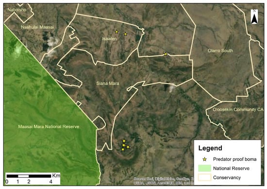 An understanding of patterns and prevalence of livestock depredation incidences is critical in designing effective mitigation measures and enhancing carnivore species conservation in human–wildlife interface areas. We investigated livestock depredation in selected community conservancies in the Maasai Mara ecosystem, Kenya. Past studies in the Mara ecosystem centered on livestock depredation in areas with close proximity to the protected area [] or in the expansive regions outside protected areas in Narok County []. “Bomas” or “Kraals” are traditional, low-tech practices where livestock are enclosed by night to keep predators at bay (Figure A1 and Figure A2). The bomas have been fairly effective in a few areas in Kenya in minimizing livestock depredation rates and conversely help in conserving large predators which are killed via retaliatory attacks []. Our study concentrated on livestock depredation within conservancies characterized by the close interface between wildlife and human beings, thus refining investigations by Kolowski [] and Mukeka []. We assessed (1) the temporal and spatial distribution of livestock depredation incidences in selected conservancies in the Mara ecosystem; (2) carnivore species associated with livestock depredation; and (3) mitigation measures, especially bomas, employed by local people and their respective successes in countering livestock depredation attacks.