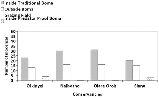 Livestock depredation incidents were prevalent in all the conservancies. This could be attributed to multiple biological and environmental factors such as livestock herd size, livestock–herder ratio, age of the herder (children or adults), herding patterns, guarding skills, predator species involved, and the proximity of human settlements [,] that are often overlooked by the community and wildlife authorities during the planning phase. The larger the herd, the higher the likelihood of losing livestock to predation. The scenario is amplified when one or few herders guard or herd large livestock numbers with the prevalent occurrences augmented when children are herding during school holidays.