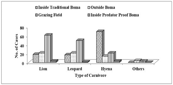 A close association between time and location of livestock depredation incidences was recorded (χ2 = 213.92, df = 3, p < 0.001). Most attacks occurred in grazing fields (44%) during the day, while livestock depredation incidents in the nighttime occurred predominantly inside traditional kraals (34%) or outside kraals (20%), and the least occurred in predator-proof or enhanced livestock kraals (2%).