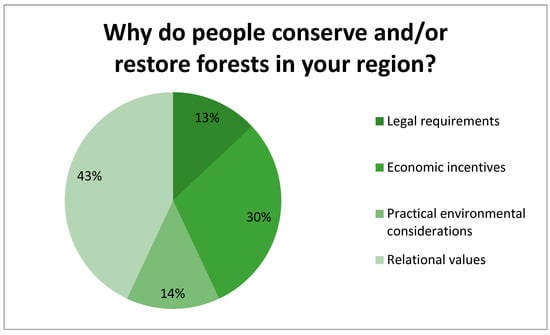 Figure 2 summarizes the interviewees’ responses to that question. The label legal requirements captures answers such as “because the law mandates” or “fear of embargoes and fines”. The label economic incentives encompasses “market pressures”, “diversify income sources”, or “lack of financial means to deforest”. The label practical environmental considerations comprises replies in the direction of “counter-balancing ecological disruption”, “experienced a decrease in environmental services” (e.g., water, pollination), or “learned new sustainable techniques to reduce environmental impacts”. The final label, relational values, in turn captures responses of the following kind: “changes in mindset”, “individual motivation”, “personal learning”, “intrinsic beliefs”, “improvements to the general well-being”, and “passion for conservation activities”. Often, interviewees referred to multiple categories in their answers. (The percentages in Figure 2 refer to the total number of coded text segments in the interviews overall. That is, 43% not of the respondents but of the total of explanations given were about relational values.)